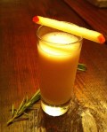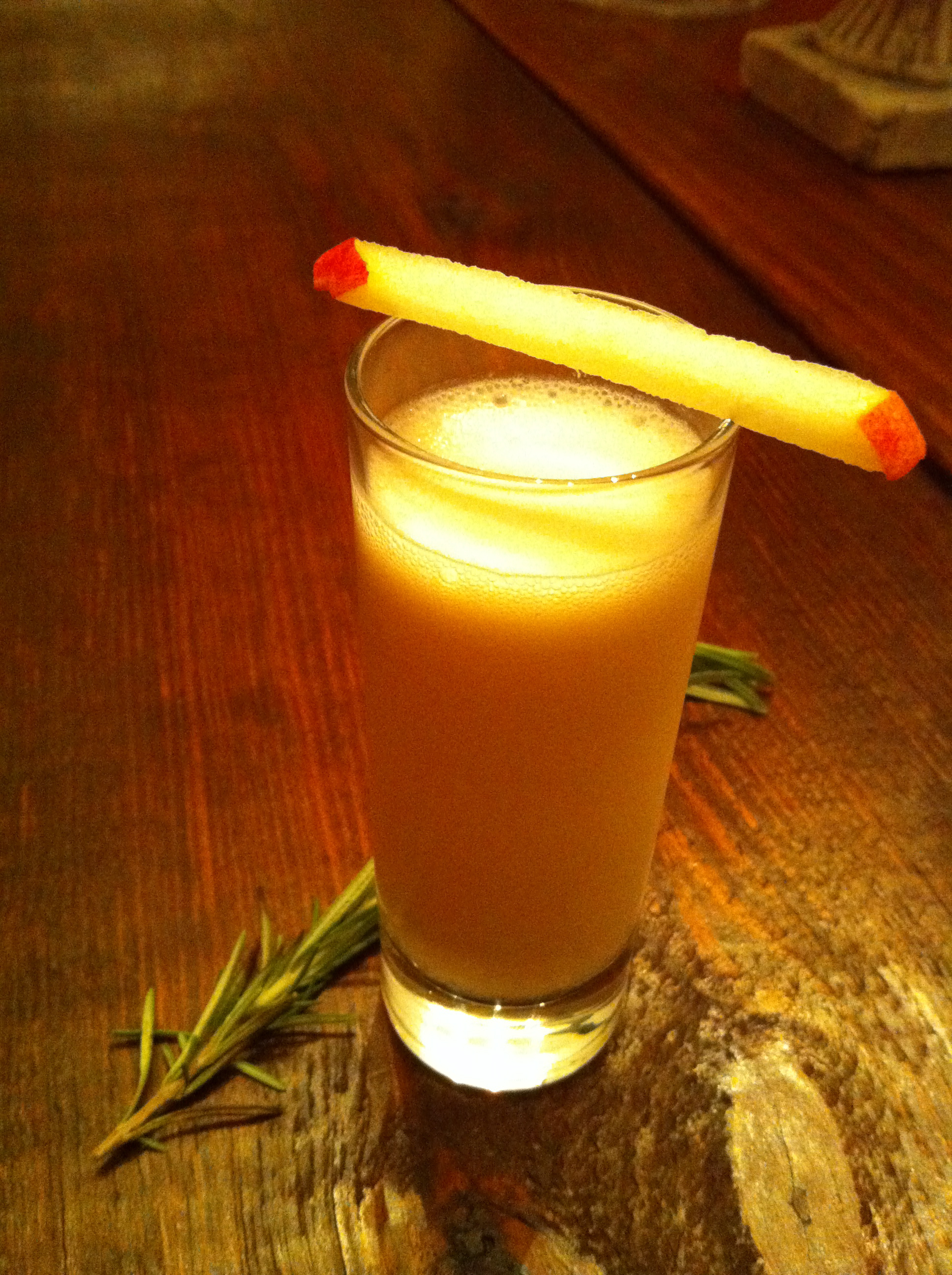 We mixed the infused Applejack and half-and-half in a two to one ratio, then added apple cider and some sage simple syrup, and a dash of angostura bitters. After shaking well, we served it up in a double shot glass with a thin apple stick across the top of the glass. It was a great balance of flavors, with a slight touch of sage on the finish. Slightly sweet from the apple. . .herbal with the rosemary and sage . . .a nice creamy texture.