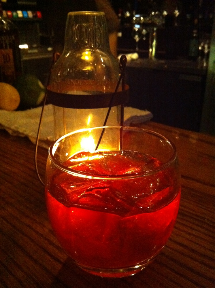 While discussing our options, Katruska and I asked the bartender if he would be able to give a preview of the upcoming menu. He very generously agreed to make us their version of an Old-Fashioned (bourbon, orange juice, sugar, grenadine*, maraschino cherry, orange peel, and Angostura bitters). In a old-fashioned glass (and thus the name) he allowed the sugar and the bitters an chance to melt together before adding the orange juice, orange peel, and cherry and muddling it all together. To this he added bourbon (Bulleit in one and I believe Evan Williams in the other) and ice before shaking well in a cocktail shaker. Both of the resulting drinks were very well balanced between bitter and sweet and would be great introduction to bourbon based beverages for the uninitiated.