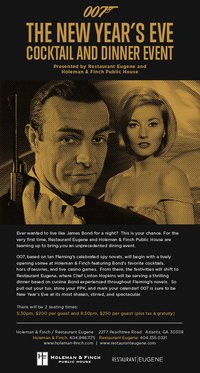 Ever wanted to live like James Bond for a night? Restaurant Eugene and Holeman & Finch Public House are teaming up to present an unprecedented dining event. 007, based on Ian Fleming’s celebrated spy novels, will begin with a lively opening soiree at Holeman & Finch featuring Bond’s favorite cocktails, hors d’oeuvres, and live casino games. From there, the festivities will shift to Restaurant Eugene, where Chef Linton Hopkins will be serving a thrilling four-course dinner based on cuisine Bond experienced throughout Fleming’s novels. So pull out your tux, shine your PPK, and mark your calendar! 007 is sure to be New Year’s Eve at its most shaken, stirred, and spectacular. Two seatings: 5:30pm, $200 per guest and 8:30pm, $250 per guest.