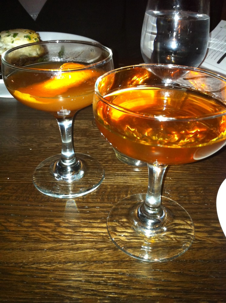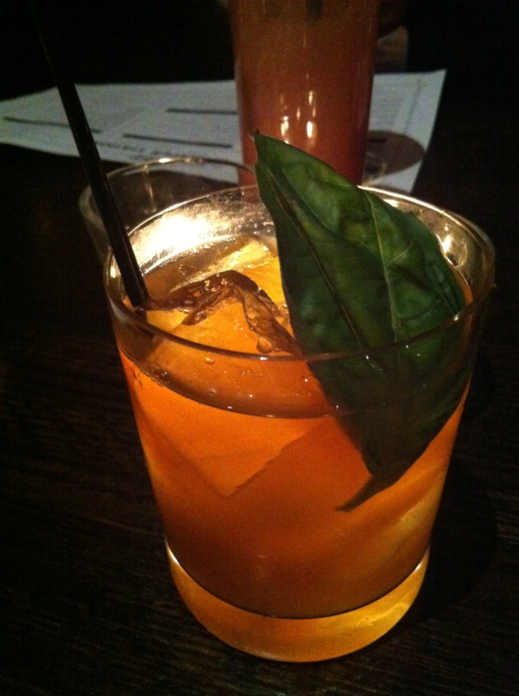 Timothy, our gracious and convivial server for the evening, recommended “The Bufala Negra” (Buffalo Trace bourbon, fresh basil, brown sugar, balsamic vinegar, house-made ginger beer). A great way to start off the evening! Slater created this back in his Louisville days as director at Seelbach’s Oakroom restaurant. The cocktail brings together two great Italian flavors: balsamic and basil. Slater uses a satisfyingly spicy house-made ginger beer. The sweet bourbon mixed with the tangy balsamic and the biting ginger beer is cut nicely with the fresh basil. There seems to be a trend in using vinegar with cocktails, marrying the sour tang of vinegar with different sugars. Nicky and I will be exploring this idea in the lab soon, I’m sure.
