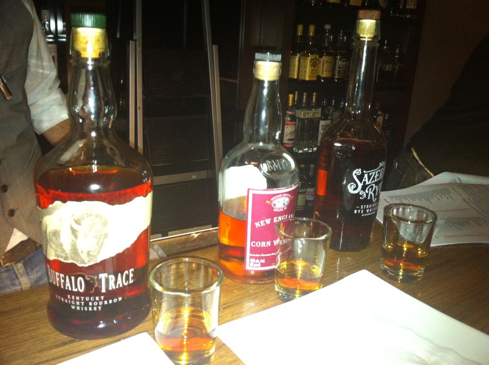 For our first round of the evening, we were lucky to have Matt Lathan, Local Three’s mixologist and bar manager, to make our selections for us. He chose a flight of of Sazerac Rye, New England Corn Whiskey, and Buffalo Trace bourbon to provide a spectrum of the flavors available in this area of liquors. We started with the Sazerac, which is of course the go to rye when making it’s namesake cocktail the Sazerac. It had a beautiful light caramel color with a faint scent of maple syrup and flavors of orange peel and brown sugar. Indeed, a great way to start. Next was the New England Corn Whiskey. This was an usual choice for a tasting, but it demonstrates what bourbon is like prior to aging in the cask. It was clear and had scents of corn silk and plum wine while its taste reminded me a bit of gin. As you can imagine, Katruska has found a new liquor for her cabinet. Who knows in what cocktail creation this new liquor will show up? The final liquor in the flight was the Buffalo Trace bourbon. It had the typical scents of vanilla and oak, but had a surprising taste of sweet tea and apricot.