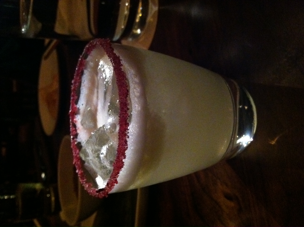 I’m pretty sure this was our favorite drink, or at least my favorite drink of the night. Smooth Herradura silver tequila plus Poire William liqueur, jalapeno and cucumber play so well together in this creation. The pear provides the right amount of subtle sweetness to balance out the ingredients. It is served in a glass beautifully rimmed with a red hibiscus salt made in-house.