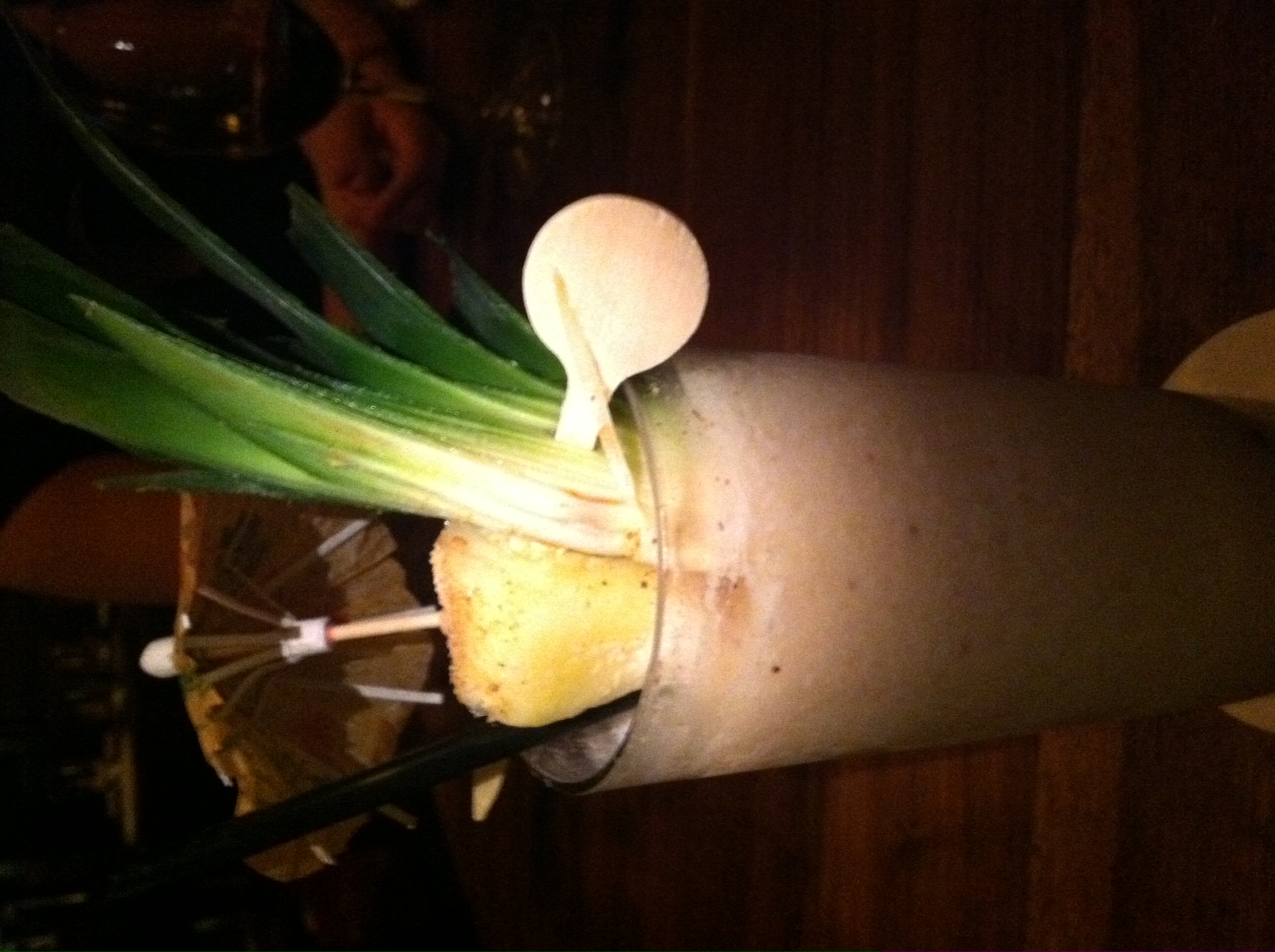 On the other end of the spectrum is the tongue-in-cheek salute to Tiki drinks. The base is a house-infused ginger rum coupled with a secret colada mix. The cocktail is served blended and in a tall glass of crushed ice adorned with lots of fruit, greenery, and the required tacky umbrella. It is a deliciously sarcastic drink that hints at cardamom, cinnamon, ginger and other notes of Christmas. Hmm. A Christmas Tiki drink. I like it.